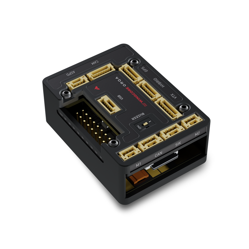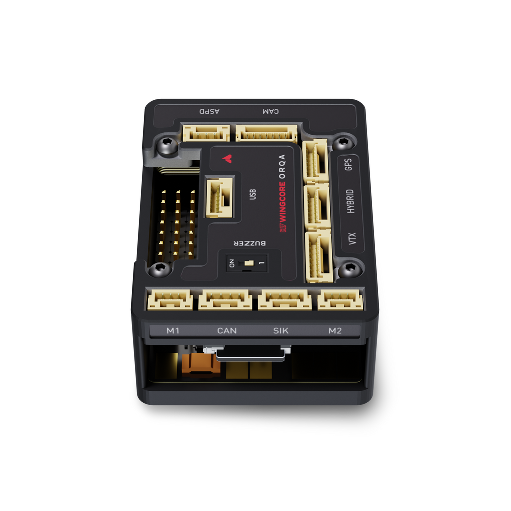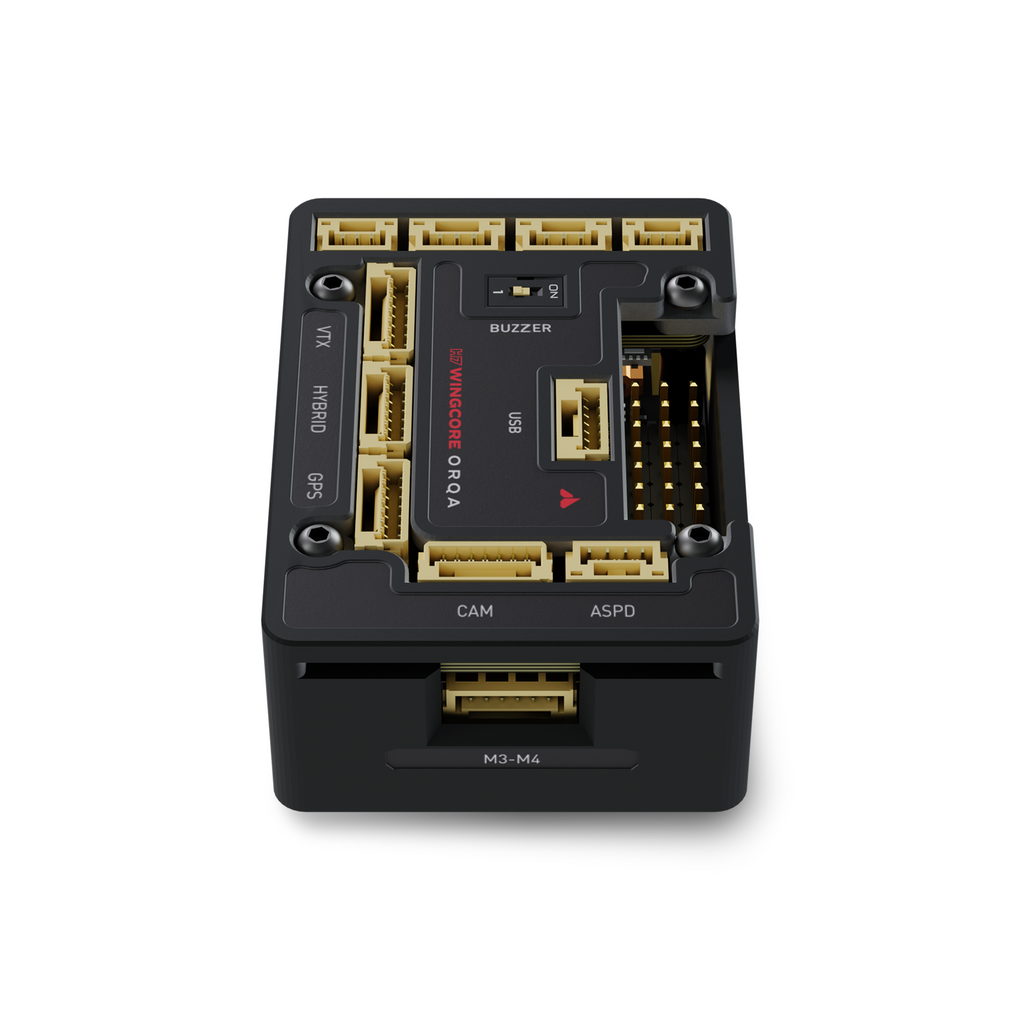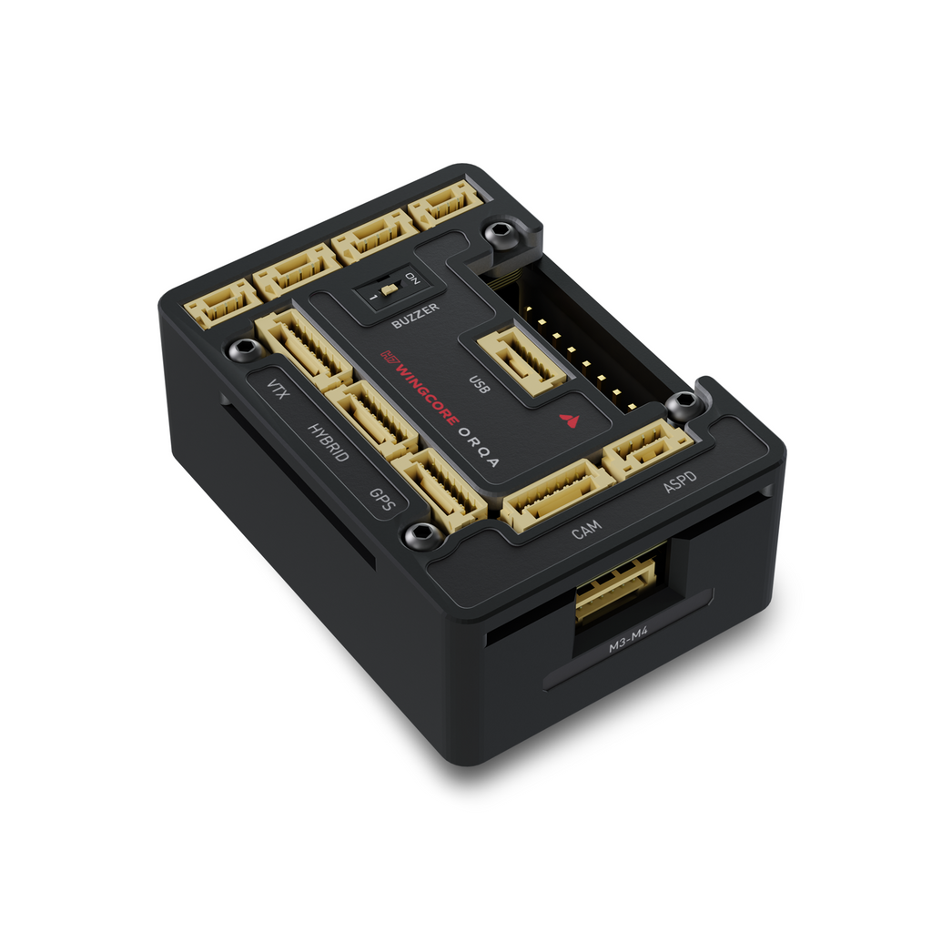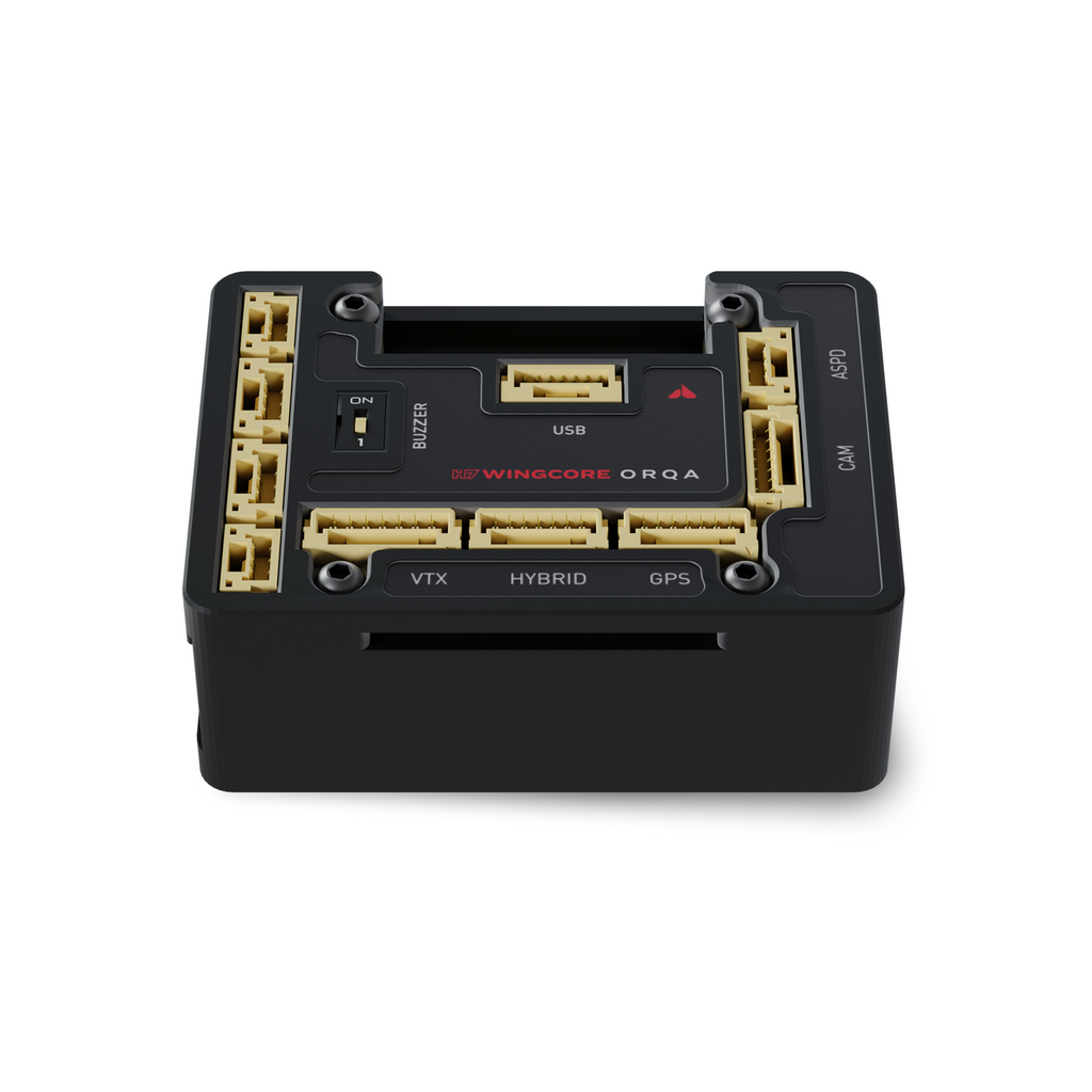 The H7 WingCore is a flight controller designed specifically for fixed wing drones, VTOLS, and UAVs. Comes with a powerful STM32H743 MCU, which runs any of the common flight controller firmware (iNav, ArduPilot, PX4). Equipped with enough servo outputs for even the most complex of fixed wing platforms, including the multi-servo requirements of VTOLs. Direct solder-free connection to most peripherals, including direct connection to Orqa’s long range C2 links, and Video Downlinks.